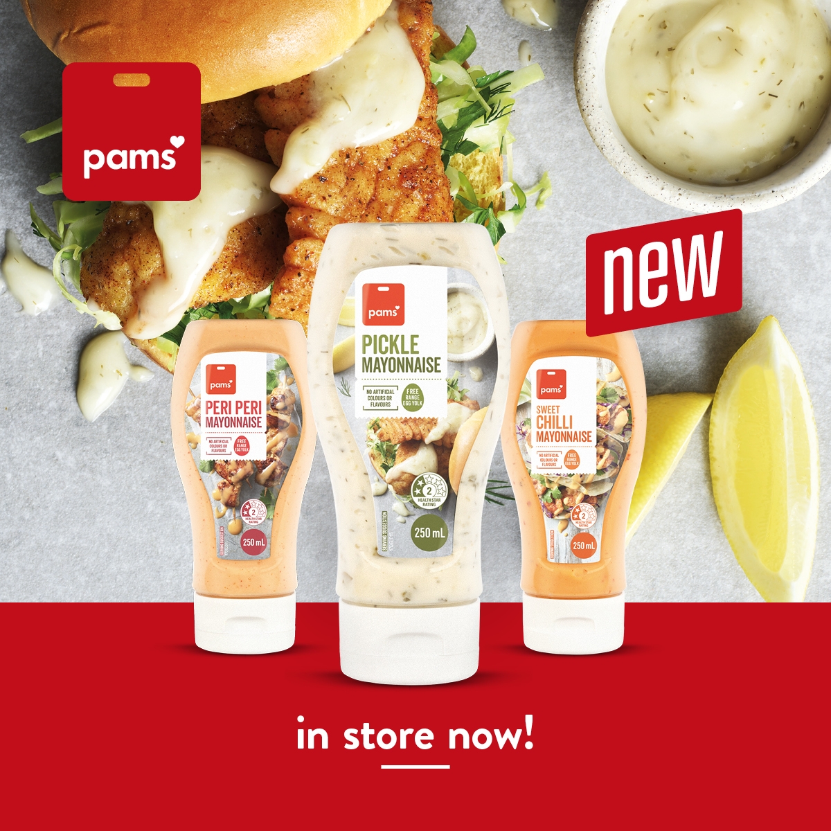 Step up your sauce game with the updated range of Pams Mayonnaise and Dressings! With a flavour for everyone, these punchy and delicious sauces and mayos are perfect for your family’s dipping, drizzling, dunking and spreading needs. Your burgers, salads, sandwiches and fries will never be the same!