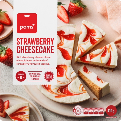 Rich Strawberry cheesecake on a biscuit base, with swirls of strawberry flavoured topping.