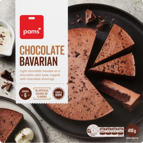 Then our Pams Chocolate Bavarian is just what you need. Light chocolate mousse on a chocolate cake base topped with chocolate shavings – this dessert really is choc full of chocolate.