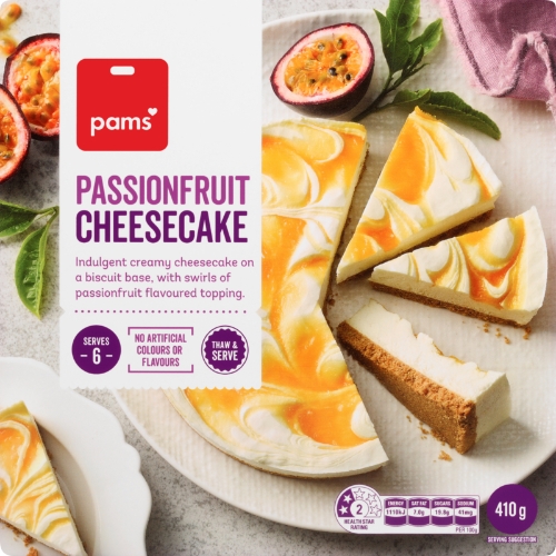 Indulgent creamy cheesecake on a biscuit base, with swirls of passionfruit flavoured topping.