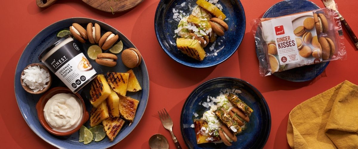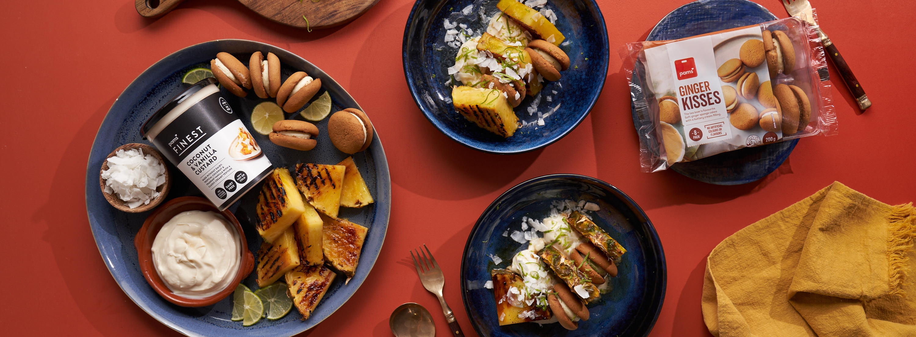Layered grilled pineapple, sweet vanilla custard and punchy ginger kisses – this combo will impress even the chocolate-obsessed guests! We love the juicy pineapple, but feel free to substitute with any of your favourite summer stone fruit like peaches or nectarines – they all grill up deliciously!