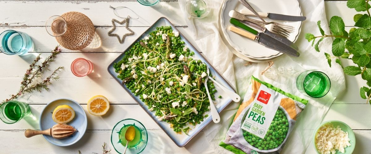 This green salad adds a fresh pop of colour to your Christmas BBQ spread. Juicy peas, spirals of courgette, tender asparagus and creamy feta – this combo will be sure to brighten up the day. We love garnishing with a heavy sprinkling of mint to boost that summer flavour! Feel free to add in a bag of the Pams Superfood Mix or your favourite leaves to bulk it up.
