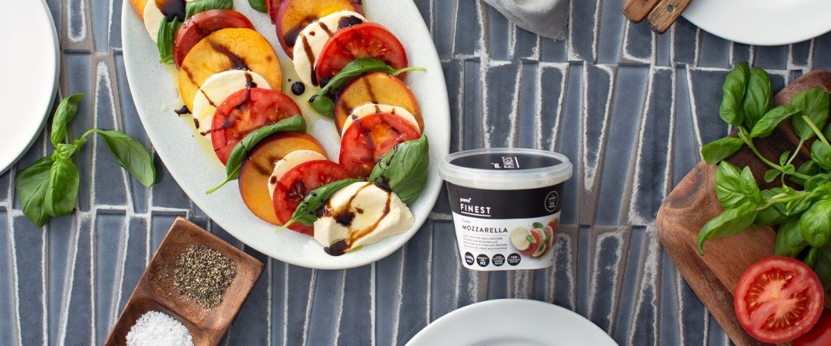 Our fresh & fruity Peach Caprese Salad is a delicious looking, and tasting, dish to bring to your festive BBQ. Substitute the juicy and sweet peaches for whatever summer stone fruit you have on hand and drizzle over some tangy balsamic dressing to elevate the flavours!