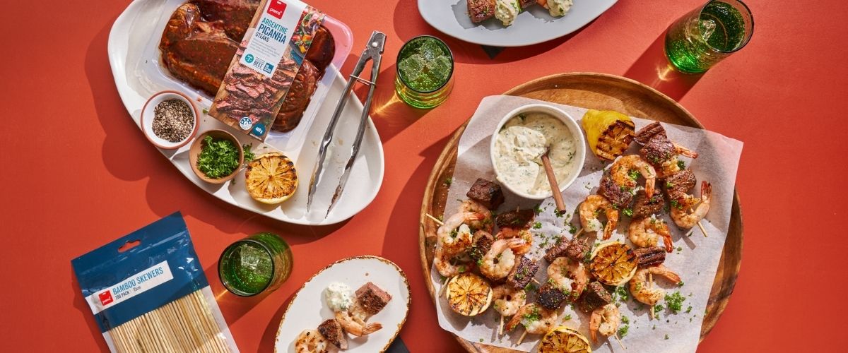 Our take on the classic surf ‘n’ turf is oh-so-simple without compromising on flavour! Simply grill these crowd pleasers earlier in the day and warm them back up in time for serving. Jazz up your presentation and boost the flavour by throwing a couple of lemon halves on the grill while your skewers are cooking.