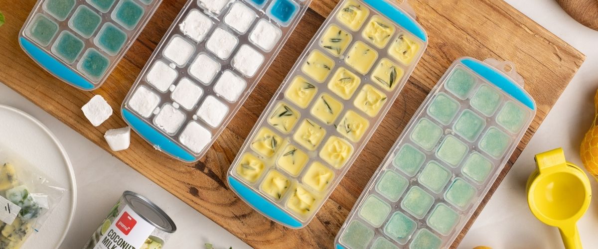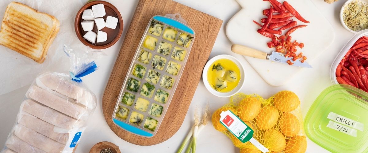 A great way to store any abundance of herbs is by freezing them submerged in olive oil in your ice cube tray. Simply chop your herbs into small pieces, pop them in the trays and fill up with the oil. Once set, keep these cubes on hand as flavour bombs to add to your meals and speed up dinner prep.