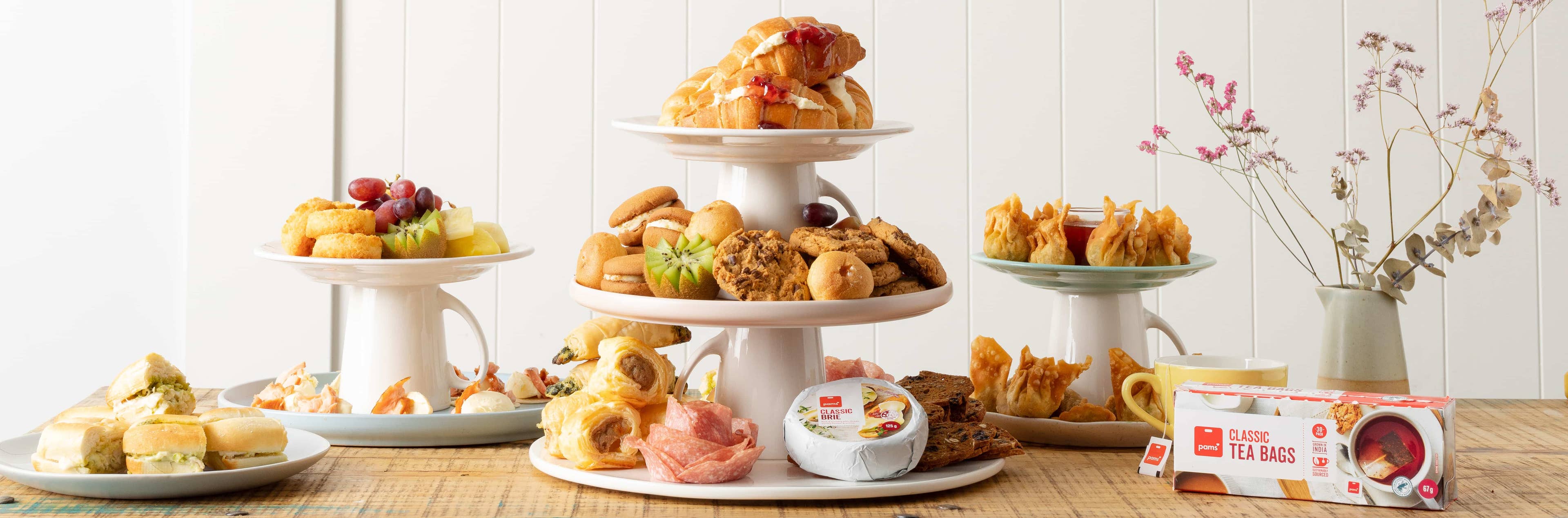 Everyone knows the star of any high tea party is the bite-size sweet treats! Some of our favourites are Pams Ginger Kisses, Pams Cream Puffs and Pams Mini Chocolate Eclairs! And don’t forget the Pams Finest Chocolate Chunk Cookies – perfect for dunking in hot drinks! Finally, try adding a selection of sliced fruit for a fresher addition to the plate.