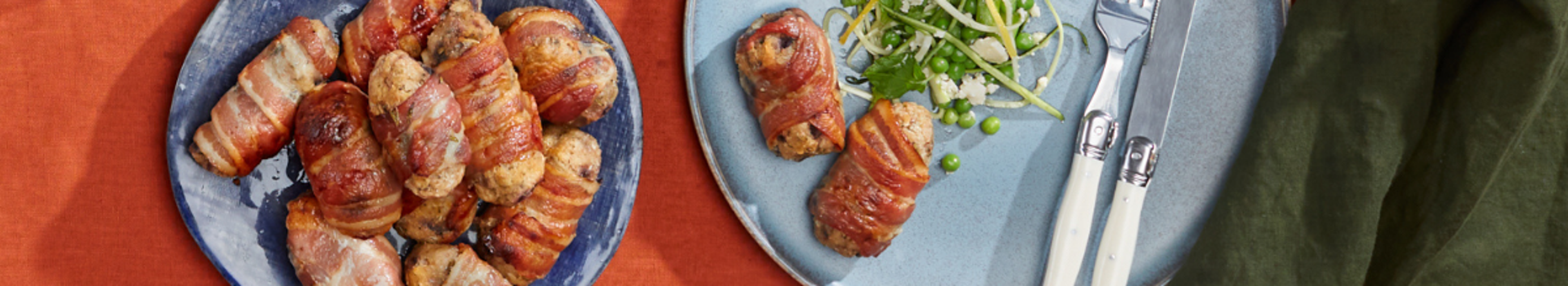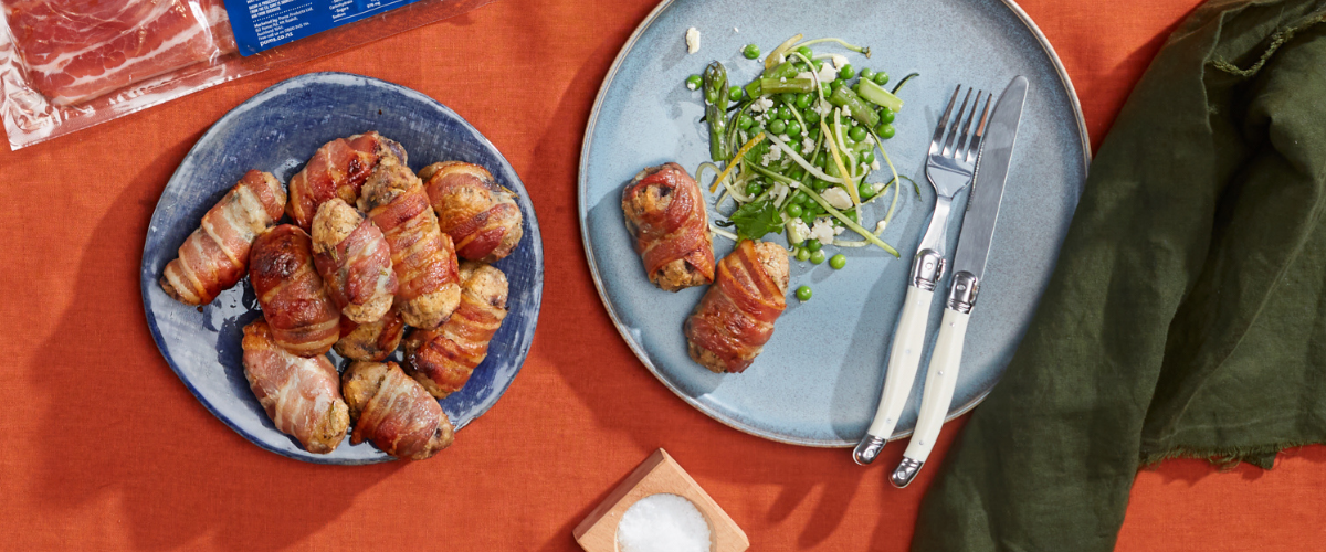 Roll the mixture into 16 golf-ball sized portions, wrap with ½ a rasher of bacon and place onto a lined baking tray. Bake for 20 minutes at 200°C. Serve while hot.