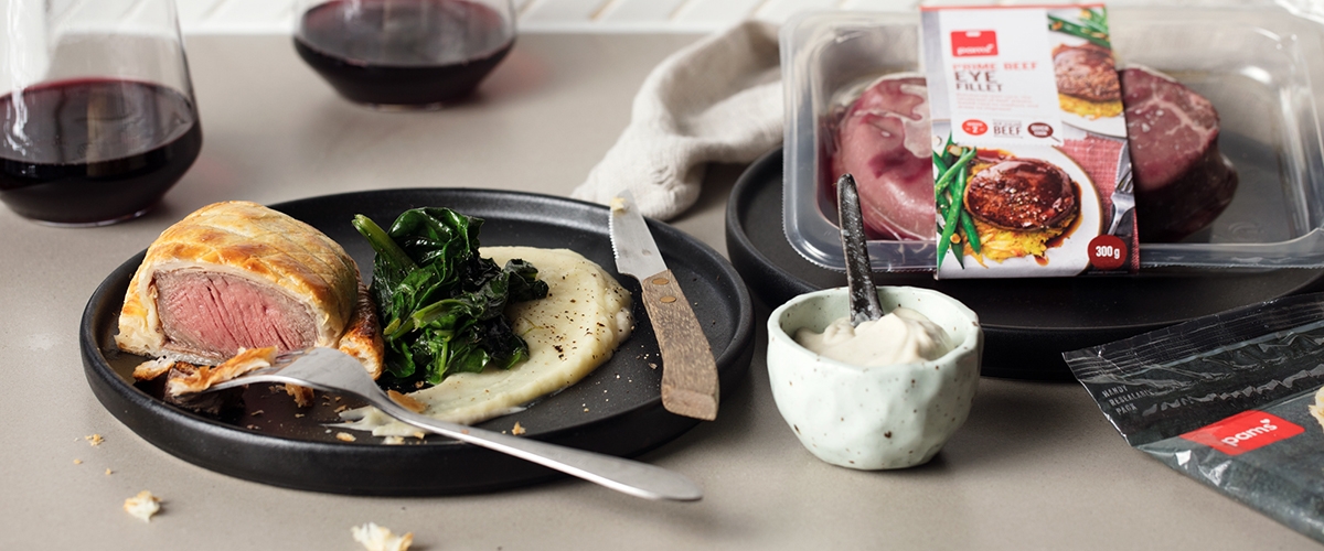 - For the perfect sides to the Beef Wellington stir a dollop of Pams Finest Mascarpone and Black Truffle cream sauce into a bowl of piping hot Pams Milk and Butter Frozen Mash. For some delicious greens, sauté Pams Fresh Spinach Leaves in a slither of butter until wilted and season with a generous pinch of nutmeg.