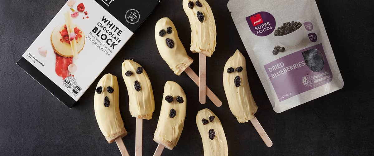 These chocolate dipped bananas taste absolutely indulgent! The eyes and mouths can also be made using Pams Dark Choc Drops or chopped Pams Black Natural Licorice.