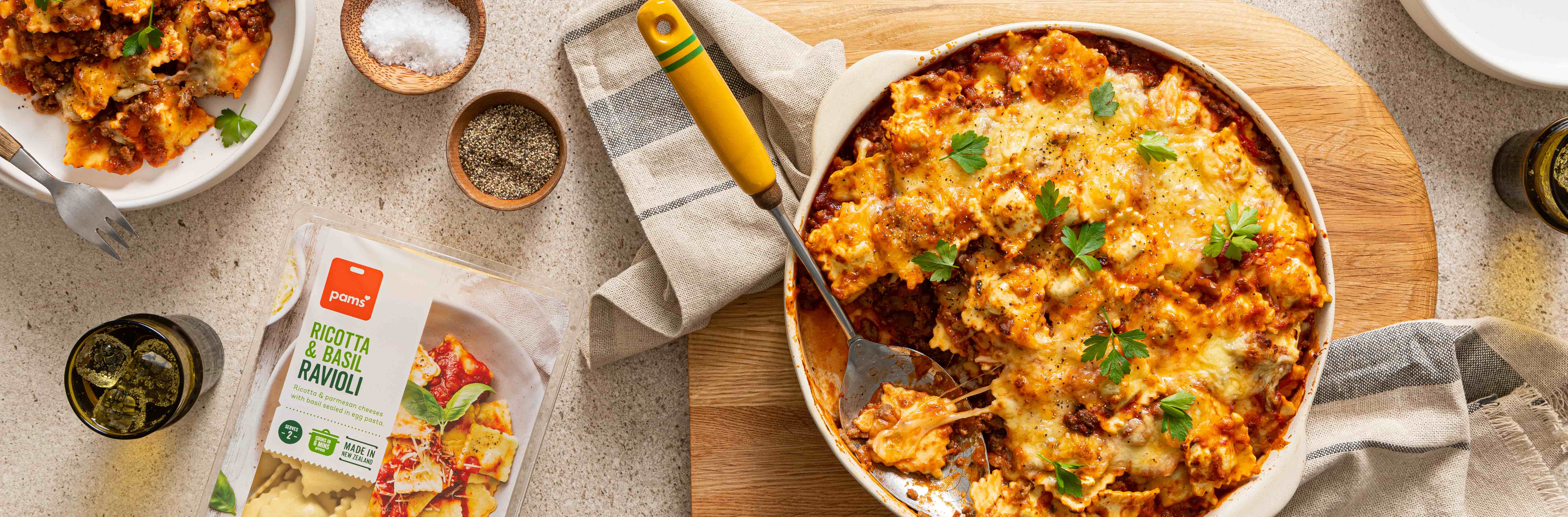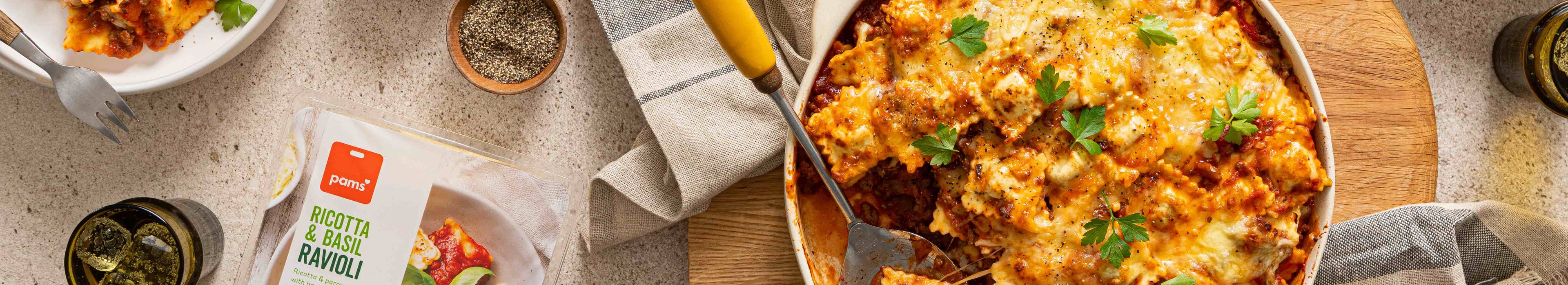 Take your packet of Pams Ricotta and Basil Ravioli to a whole new level with this saucy ground beef pasta bake topped with deliciously gooey cheese.