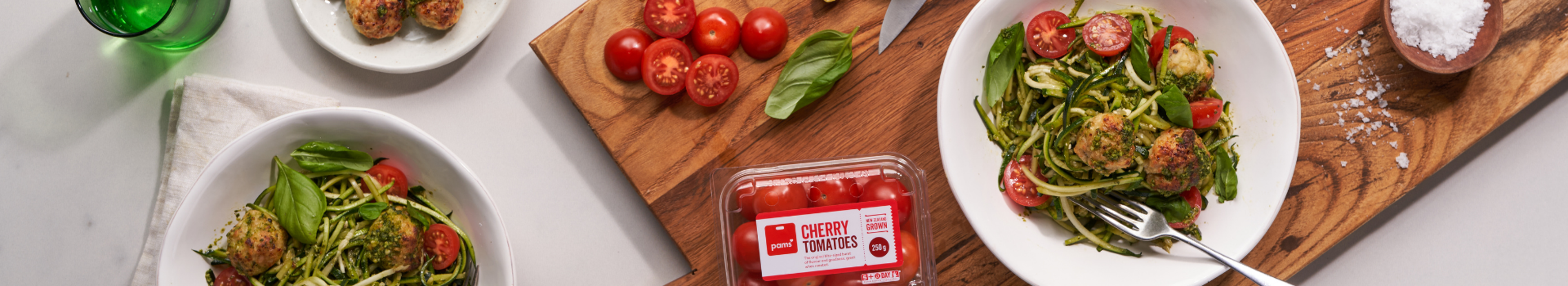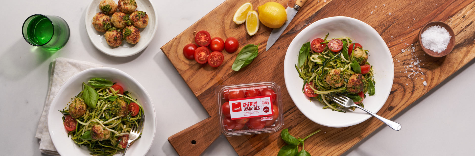 Heat a splash of olive oil in a large fry pan over medium heat and cook the courgette noodles for 1-2 minutes until warmed through. Add the remaining pesto and cherry tomatoes and gently toss to combine.