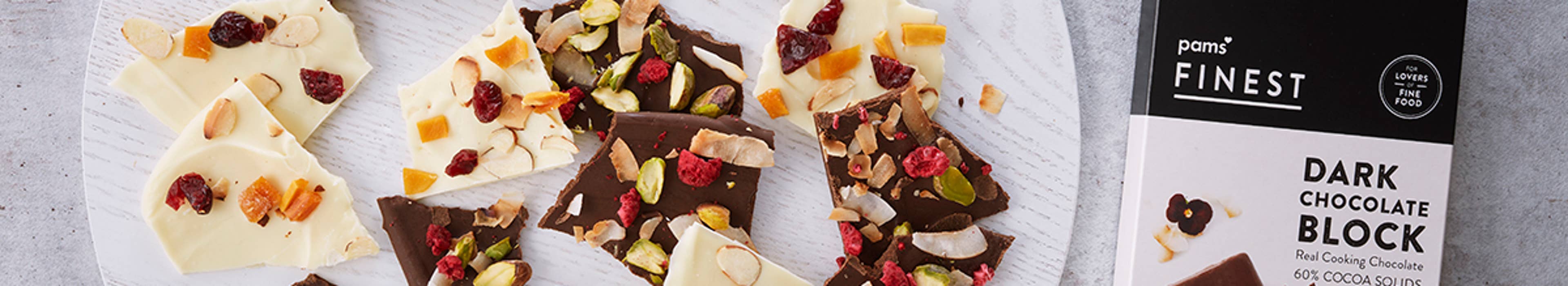 - The only limit is your imagination with chocolate bark! Try out our dark chocolate version too, made with Pams Finest Dark Chocolate Block, freeze dried raspberries, coconut chips and pistachio nuts. Or, throw in your own mix of nuts, seeds and fried fruits to make your own concoction!