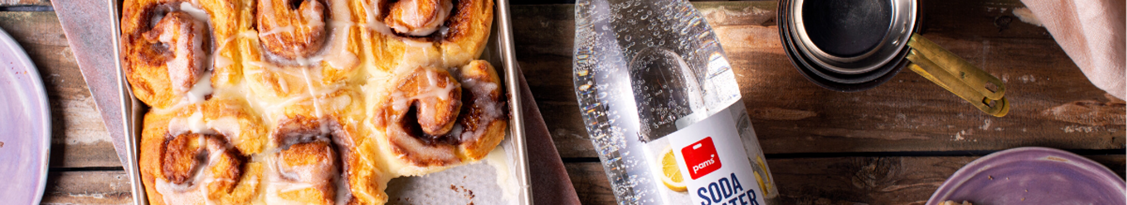 - While your scrolls are baking, mix up a simple glaze, using ¾ cup of Pams Icing Sugar, 1 Tbsp of Pams Butter and 2 Tbsp of milk. Drizzle the glaze over once the scrolls have cooled for a few minutes.