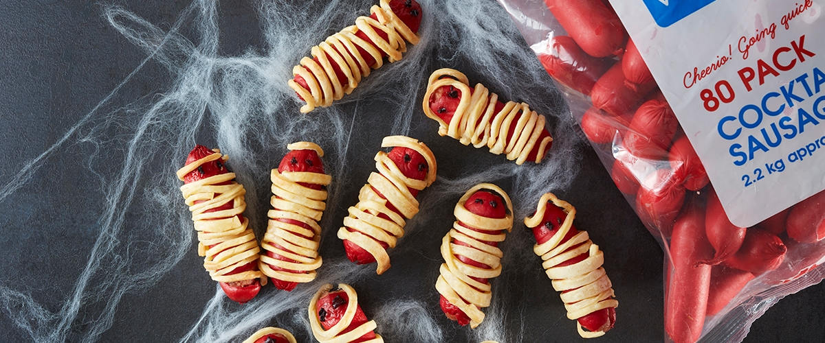 Arrange mummies on a baking paper lined tray and cook for 10-12 minutes until the pastry is crisp.