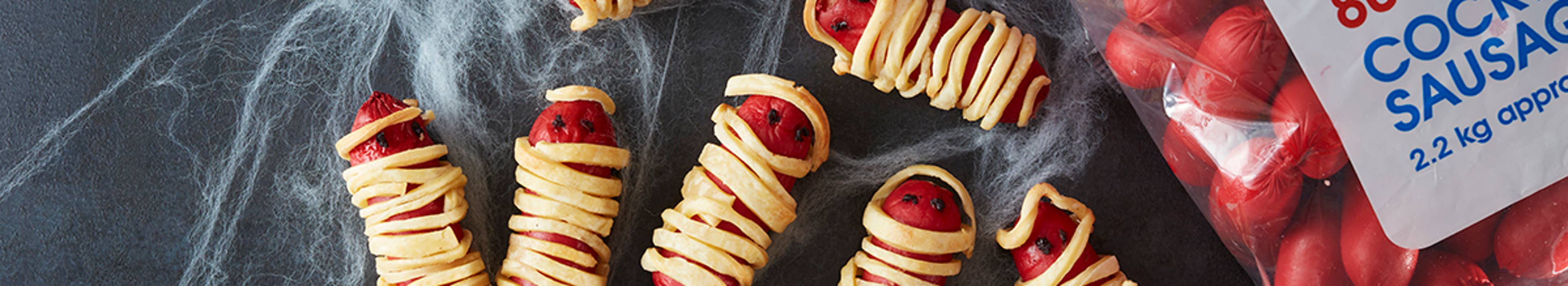 Wrap each cocktail sausage in pastry, leaving enough space for a face.
