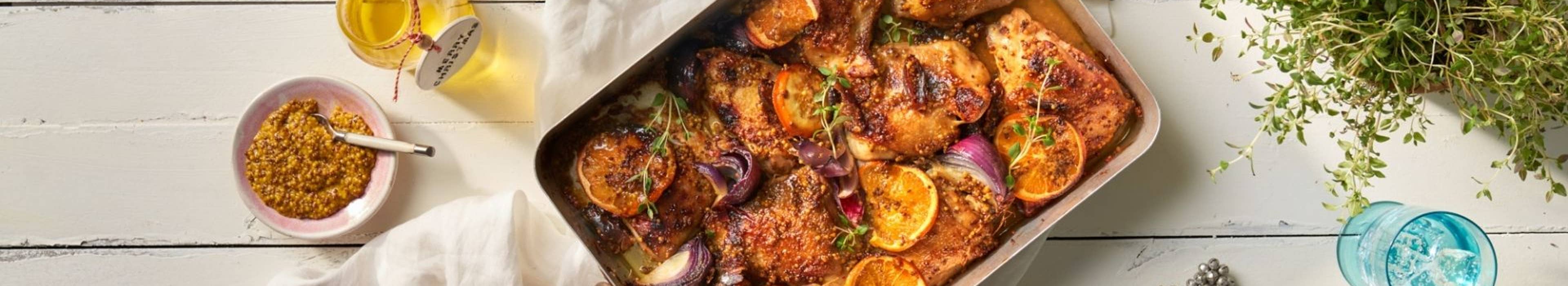Mix the mustard, orange zest & juice and a big glug of olive oil together in a small bowl and pour over the chicken. Sprinkle the cumin seeds over the chicken and add a splash of vinegar or water into bottom of the baking dish.
