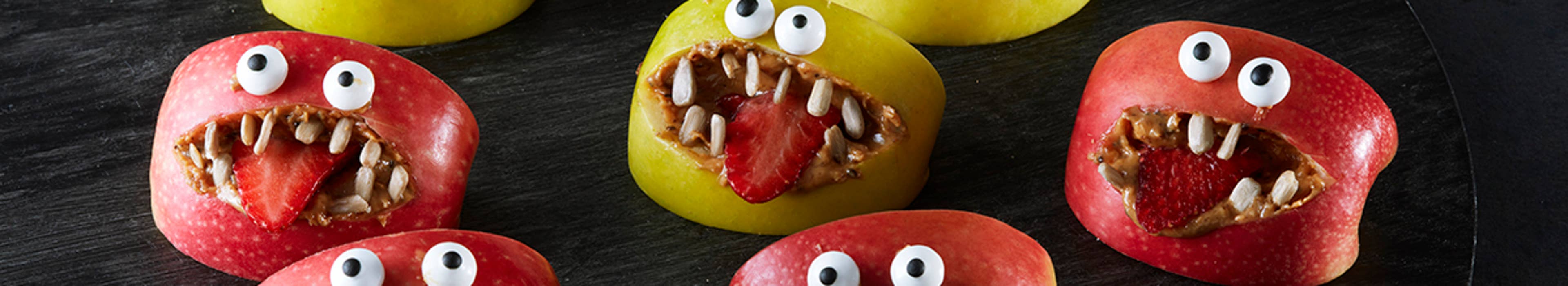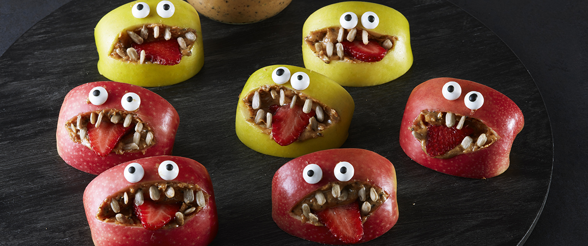 Make a tongue out of strawberry to protrude from each “mouth”. Press the sunflower seeds into the cut apple surfaces to create teeth. Stick eyes onto the skin above the mouth using a little nut butter as glue.