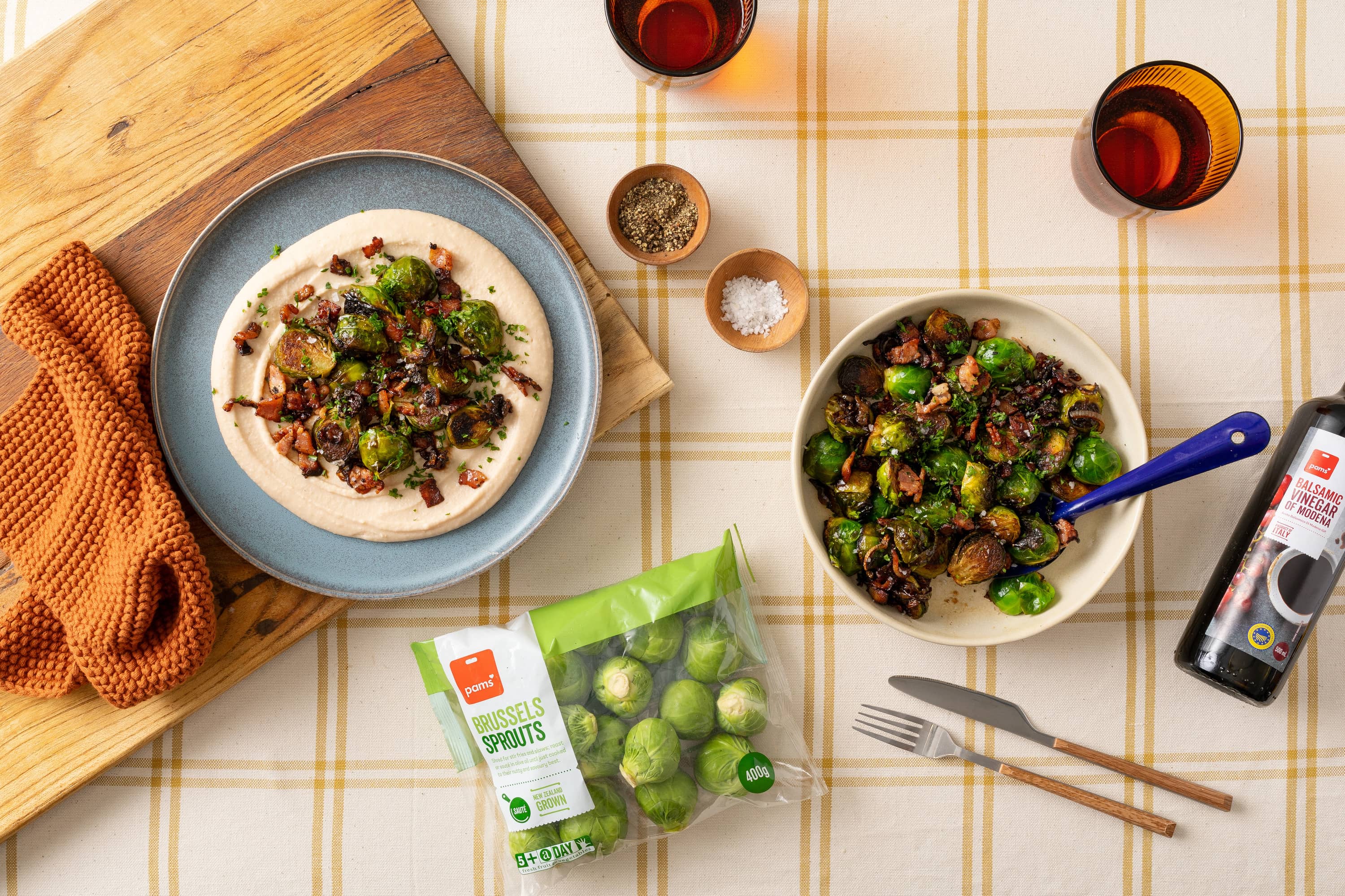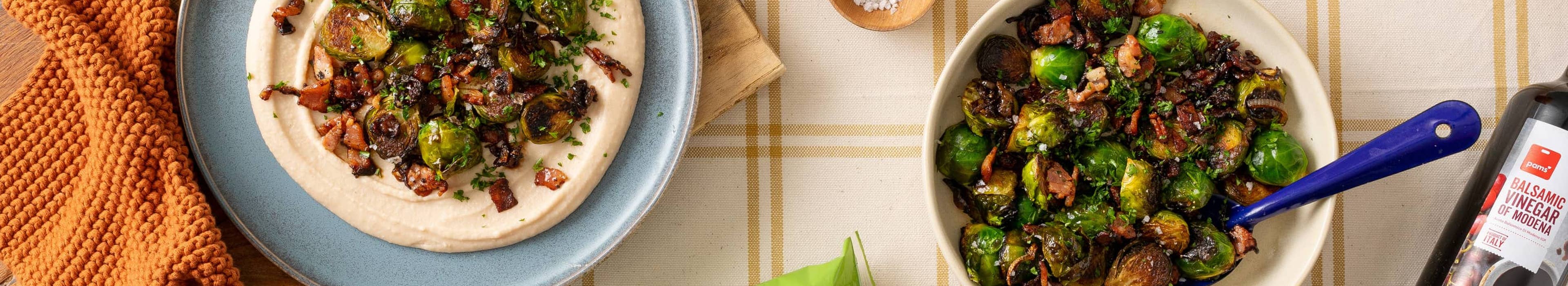 Serve your crispy brussels sprouts on a bed of mashed white beans! Simply add a can of drained and rinsed Pams Cannellini Beans to a saucepan with 1/3 cup vegetable stock. Simmer for a few minutes until the beans are tender then mash or blitz until smooth. Season with salt and pepper and load your brussels sprouts on top.