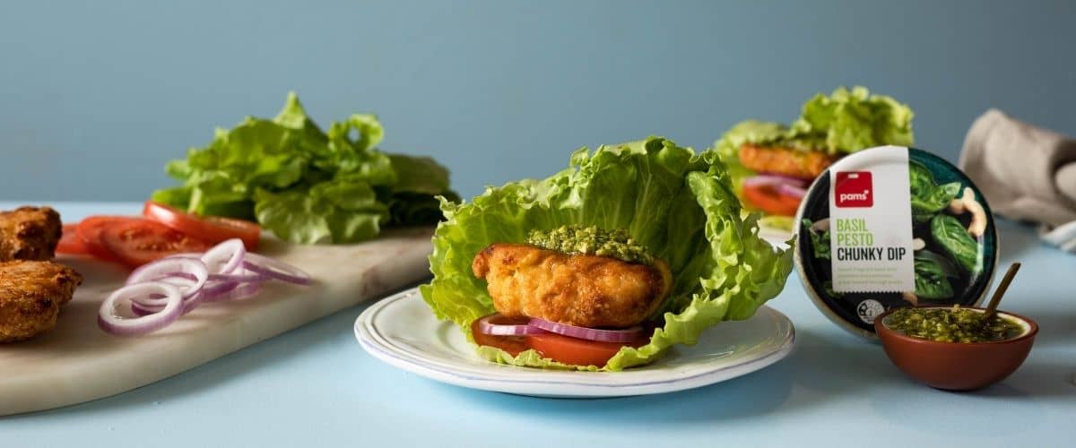 Assemble your burgers by placing a couple iceberg lettuce leaves on a plate, top with your crispy chicken, a dollop of pesto and a couple more iceberg lettuce leaves to create your “bun”. Pick it up with your hands, and eat immediately!