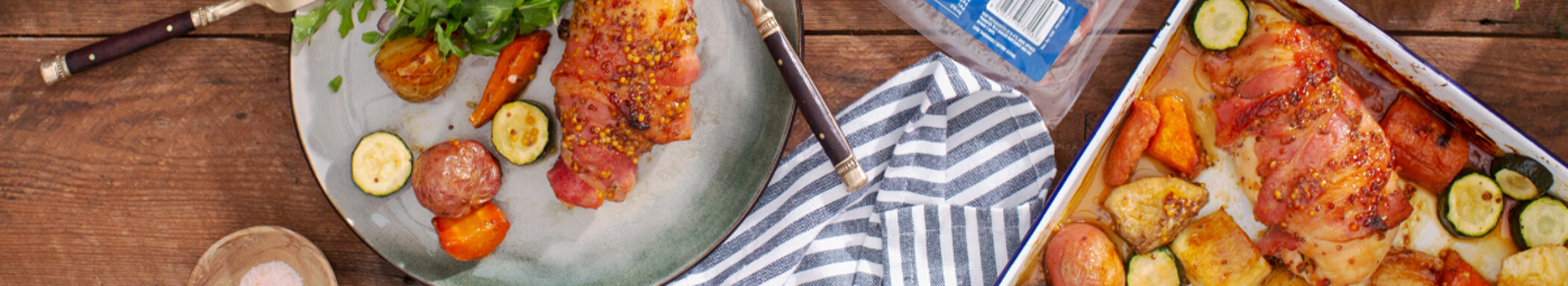 Our Easy Chicken Tray Bake is the perfect no-fuss meal. Made with Pams Mini Roasties and paired??with honey mustard chicken wrapped in bacon, it’s sure to sure to impress the whole family (even though it’s wonderfully simple to put together). Don’t have any of our mini roasties? They’re easily subbed for half a kilo of your favourite mixed, seasonal veg.