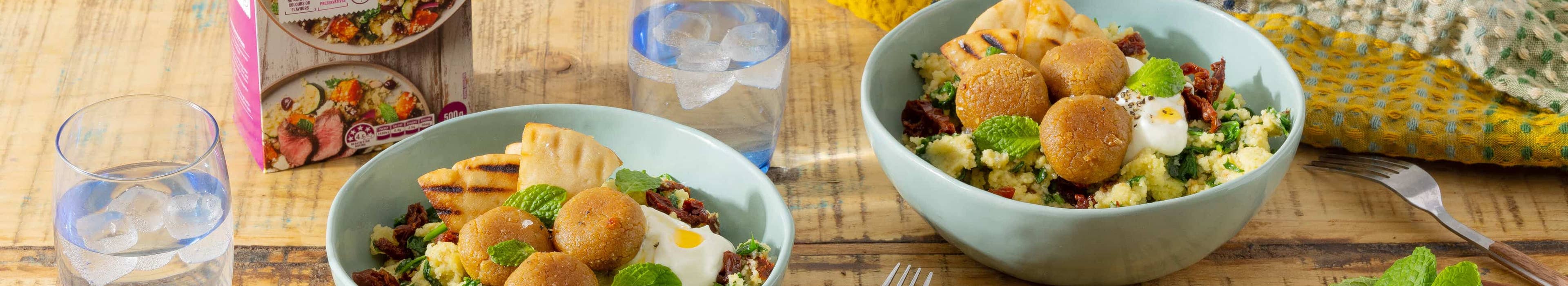 Place the couscous in serving bowls and top with the falafel and pita chips.