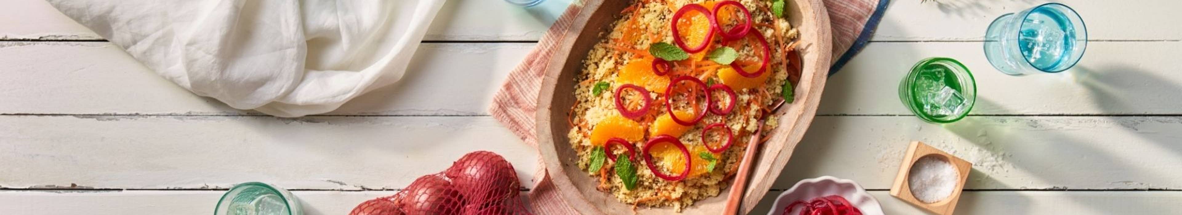 Place the cooled couscous into a large serving dish and douse generously with olive oil. Mix through the carrot, orange segments, remaining red onion (sliced in rings) and mint.