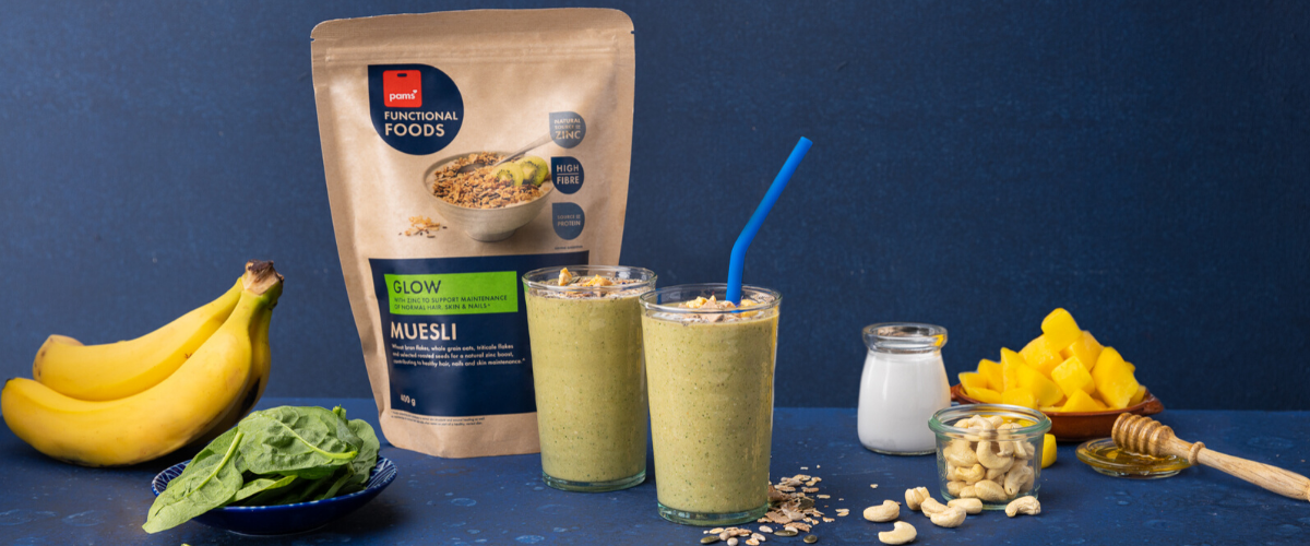 To get the most out of your morning smoothie, you want to pack in maximum goodness without losing the great flavour. We reckon we’ve nailed the perfect functional smoothie - packed with Pams Functional Glow Muesli, spinach, banana and cashews, it’s the perfect start to your day!