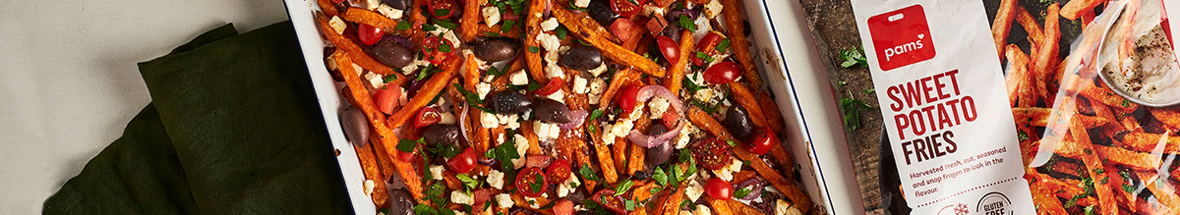 Our Mediterranean take on loaded fries, where the saltiness of the feta perfectly matches the sweetness of the sweet potato fries.
