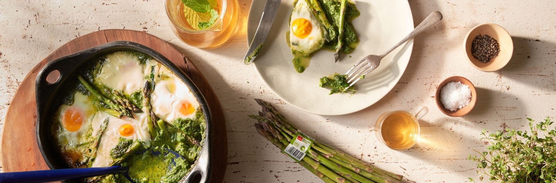 Pour the sauce back into the same pan, and scatter over the asparagus. Use a spoon to create little nests in the gaps for the eggs to be cracked in to. Drop your eggs into the holes then bake in the oven at 200°C for 15 - 20 minutes, or until the eggs are cooked through.