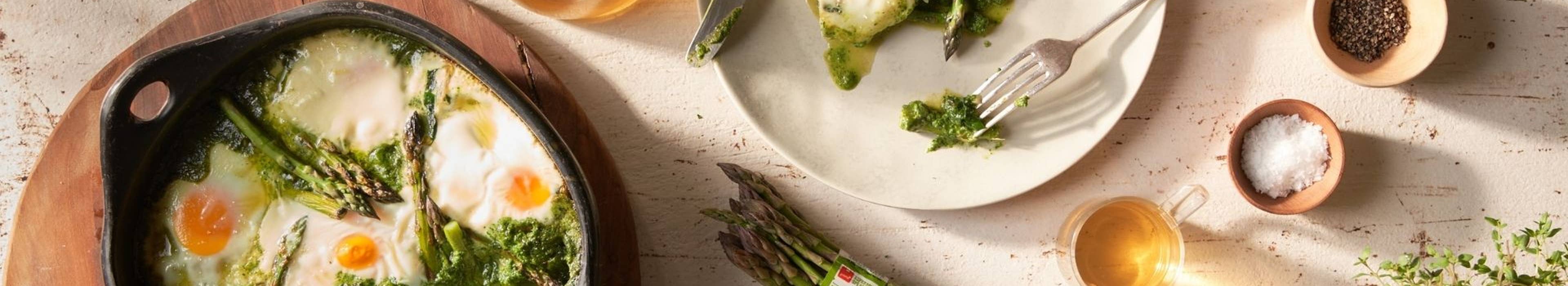 Add a splash of oil to a large oven-safe fry pan over medium heat and sauté the onions & garlic until soft & fragrant. Add the blanched greens and reserved water and season with salt & pepper. Continue cooking for a few minutes. Remove the asparagus and set aside.