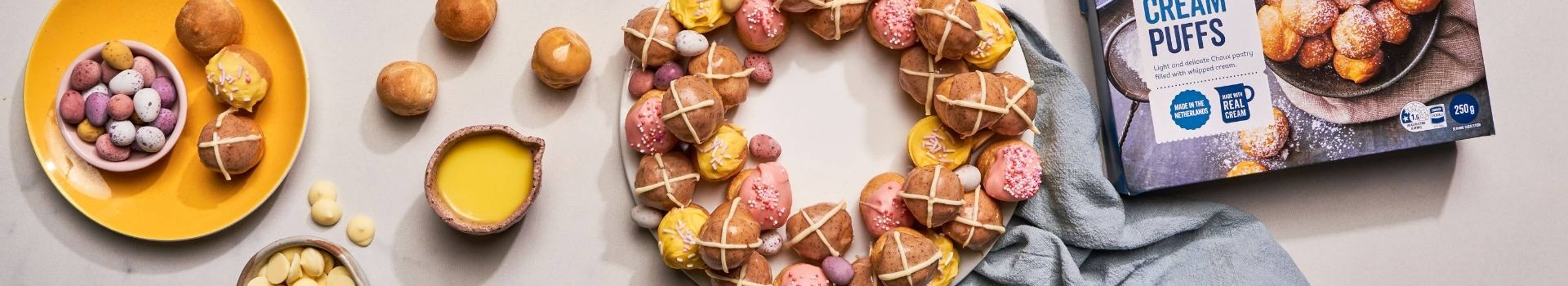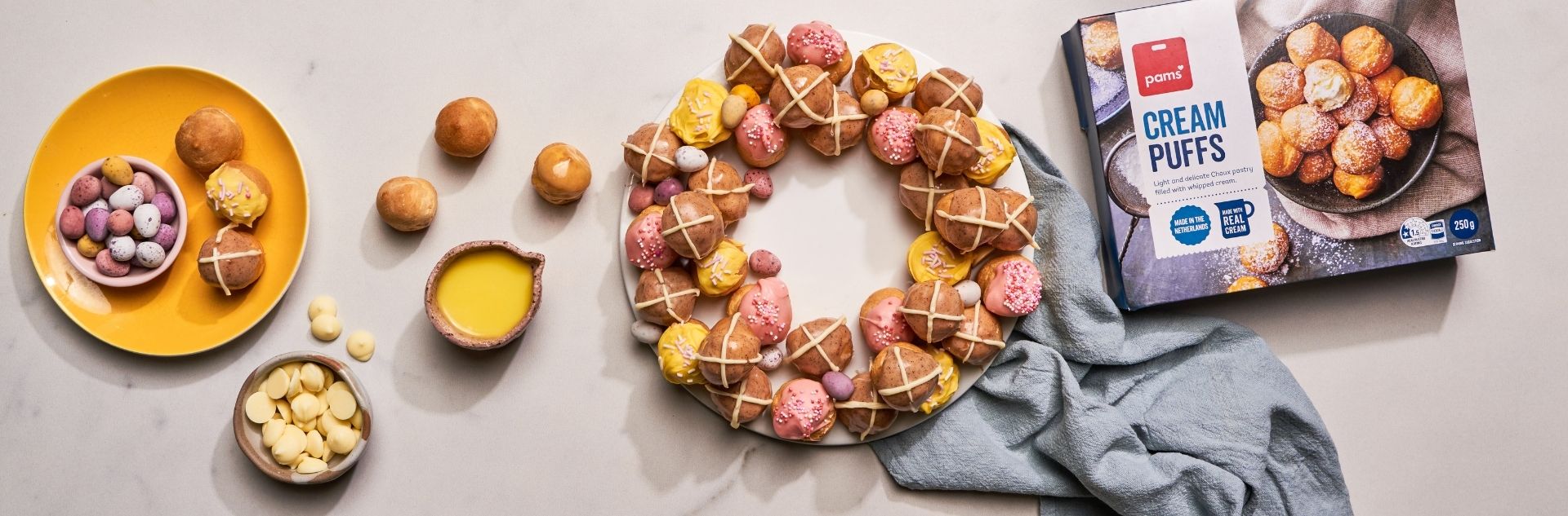 - Make your Hot Cross Cream Puff platter extra festive by decorating with Easter eggs!