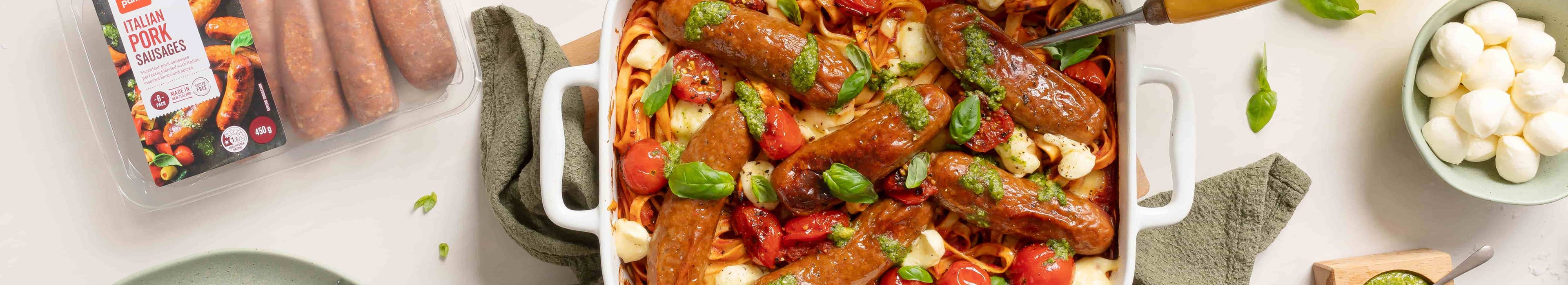 Remove from the oven and remove the foil. Nestle the sausages on top of the saucy pasta and arrange ½ the bocconcini around them. Place back in the oven, uncovered for 15 minutes.