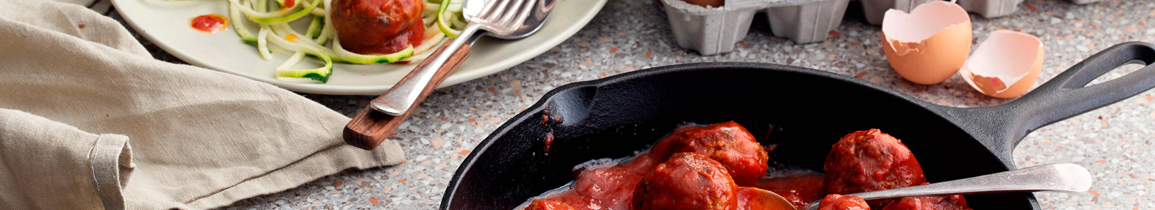 Divide the spiralized courgette, meatballs and pasta sauce between bowls and serve immediately.
