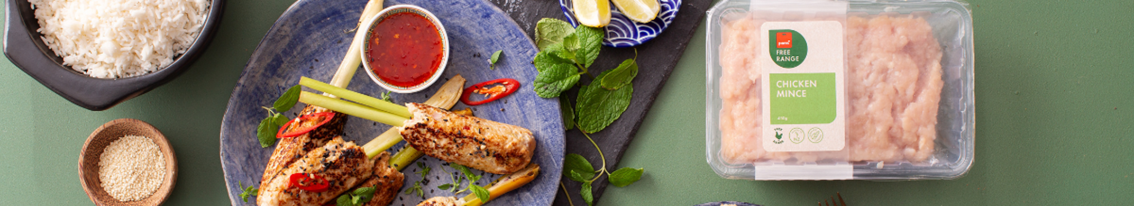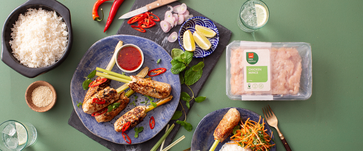 - If you can’t get your hands on fresh lemon grass, substitute the lemongrass in the chicken mix for 2 teaspoons of lemongrass paste or 2 tablespoons of lemon grass from the jar. Skewer the chicken with Pams Bamboo Skewers to present.