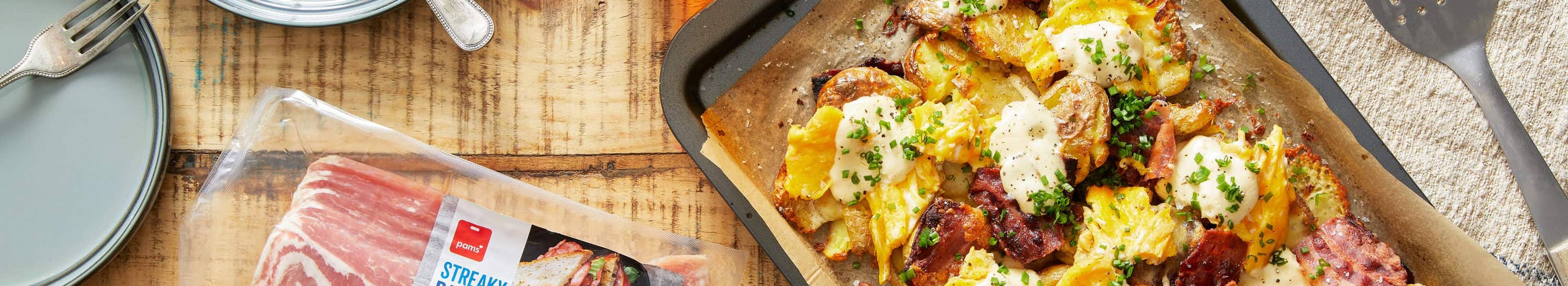 Try this delicious, easy breakfast idea for a special weekend treat! With crispy, golden smashed potatoes, smoky bacon and creamy hollandaise sauce, this combination won’t disappoint!