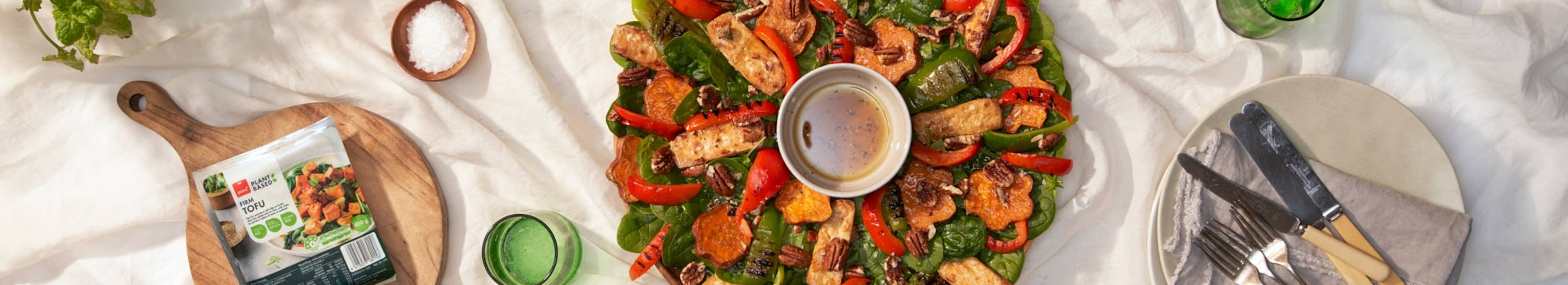 Assemble the salad by arranging the spinach leaves in the shape of a wreath on a large flat serving platter. Top with layers of kūmara, tofu & capsicum and sprinkle with the pecans. Place the remaining dressing in a small bowl in the middle of the wreath.