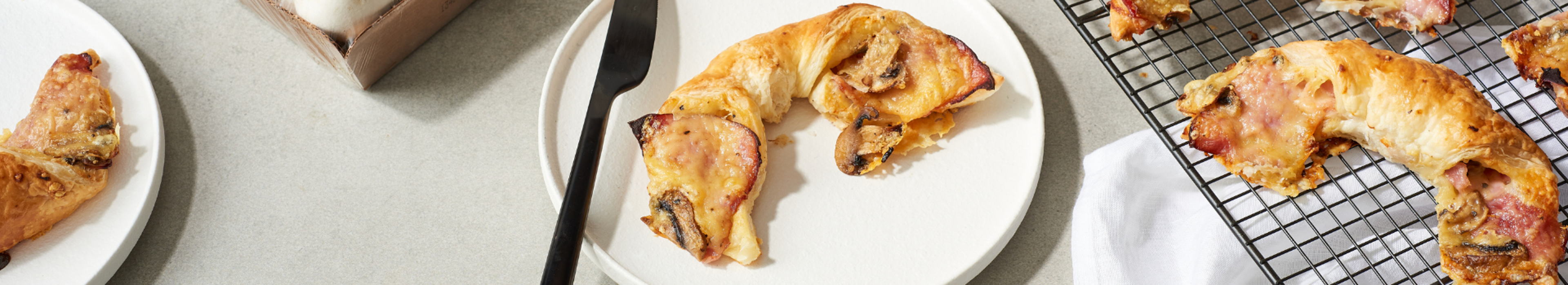 Place a piece of ham, a sprinkle of cheese and a few mushrooms at the base of each triangle. Starting at the base, roll the pastry up and secure at the point. Bend in the edges slightly to create a crescent shape and place on a large baking tray. Repeat with each triangle.