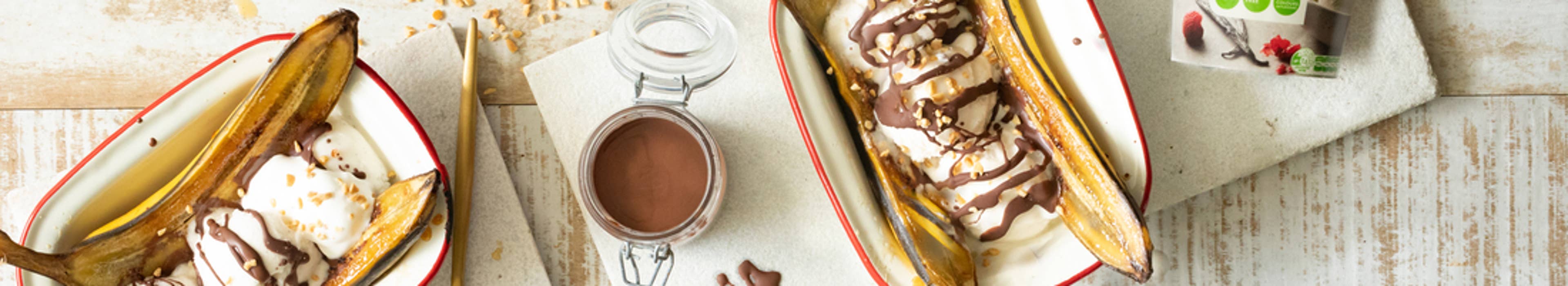 To assemble, place the caramelised bananas in the bottom of your serving bowls, top with scoops of ice cream, a dollop of coconut cream and drizzle over the chocolate which will harden as it hits the cold ice cream.