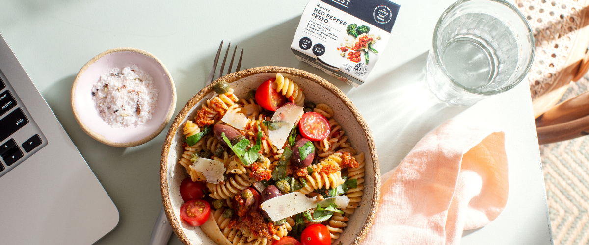 Our Red Pesto Pasta is a great working from home lunch – and makes delicious leftovers! Dish it up hot or cold, both options taste great.