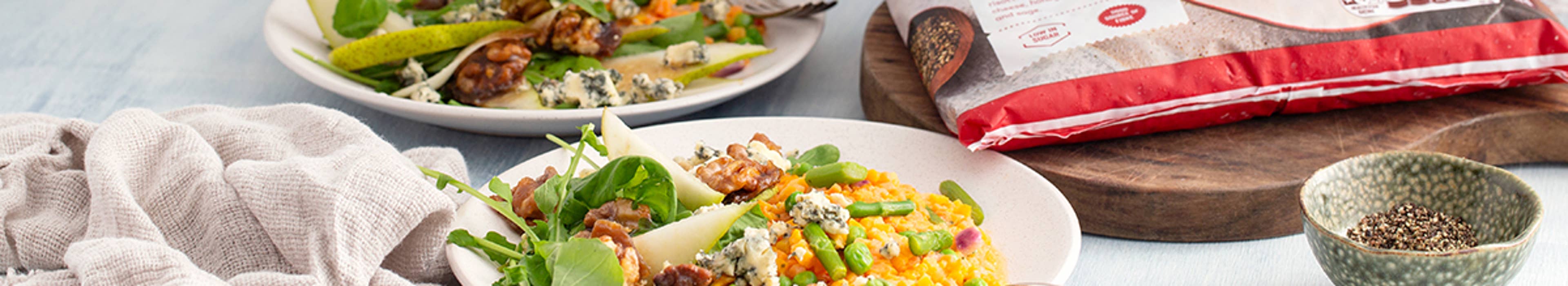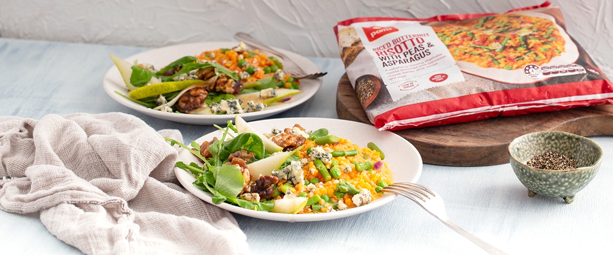 A delicious meal idea any night of the week, our riced butternut risotto is silky, creamy and easy to prepare. Pieces of crunchy pear and toasted walnuts add extra bursts of flavour to the rocket and blue cheese salad.