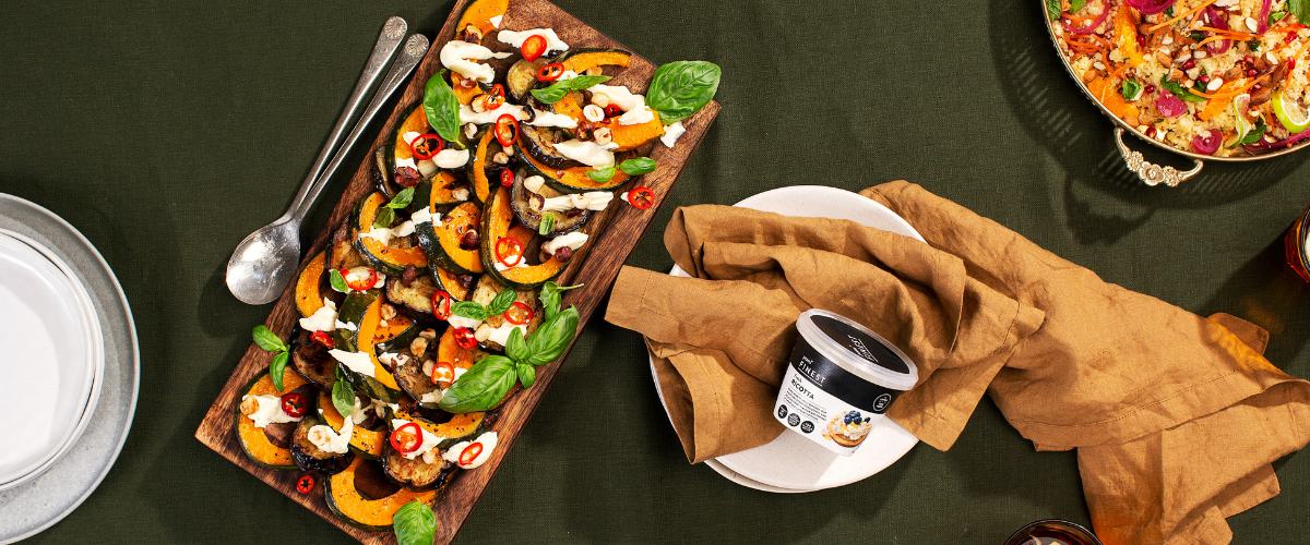 This roasted salad dish is an utterly morish addition to your family feast. When blending the ricotta, add some lemon zest and juice, and a generous quarter cup of Pams Extra Virgin Olive Oil to make it extra silky, rich, and smooth.