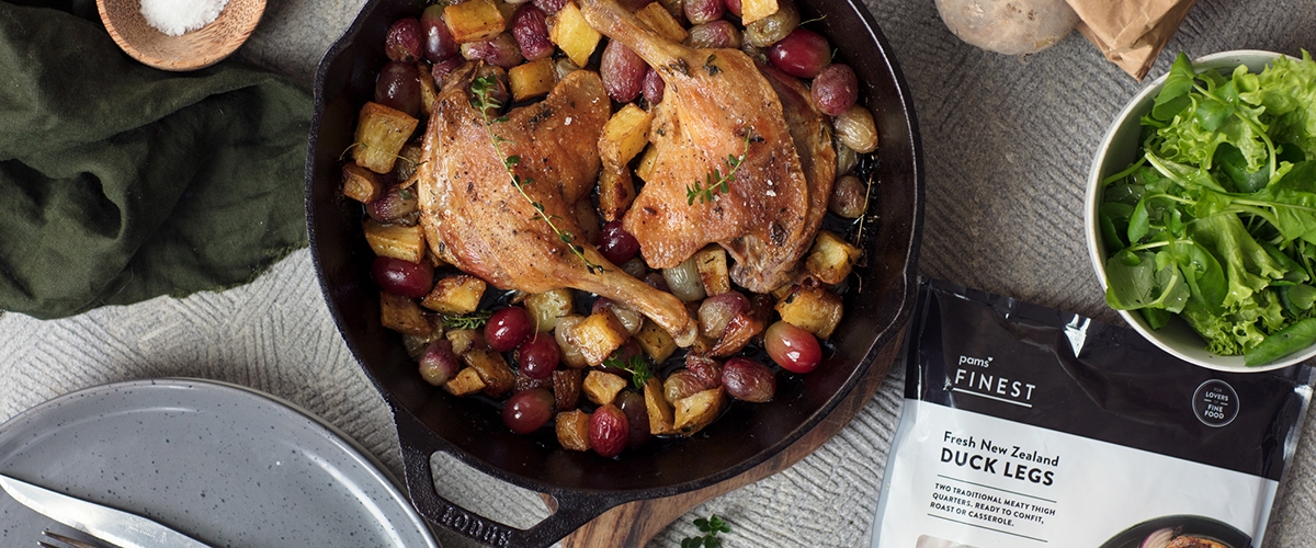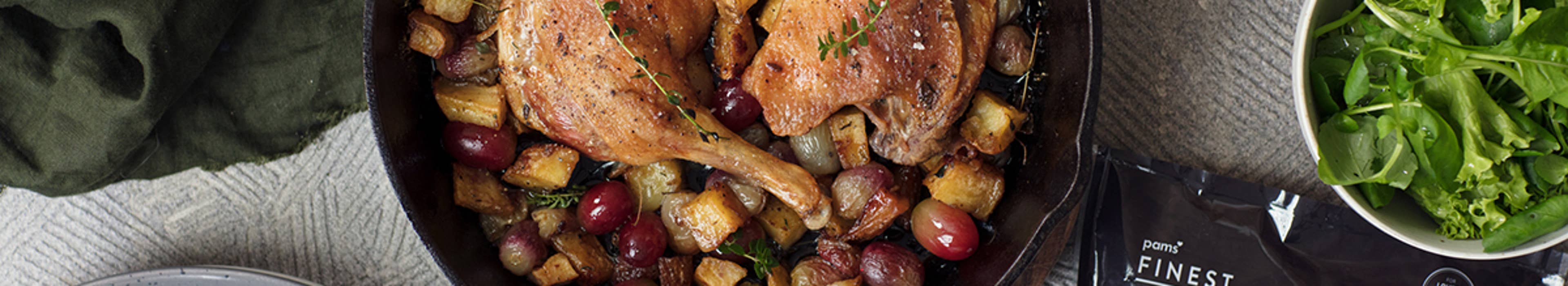 Winter weekends call for evening meals to be cooked low and slow - and this one is a special meal to share with a special someone. With little prep time, our roasted duck allows you to throw everything in the oven and spend more time catching up with loved ones, while it cooks. Serve with a simple green salad to balance the richness of the duck and sweetness of the grapes. An oven proof frying pan works best, but if you don’t own one, transferring the duck and potatoes from your frying pan to any oven proof dish will work fine.