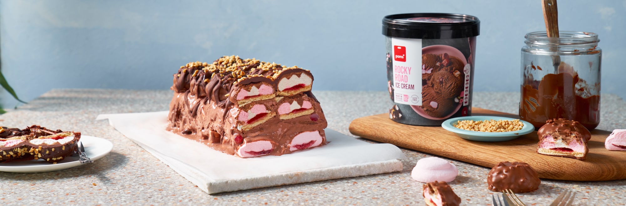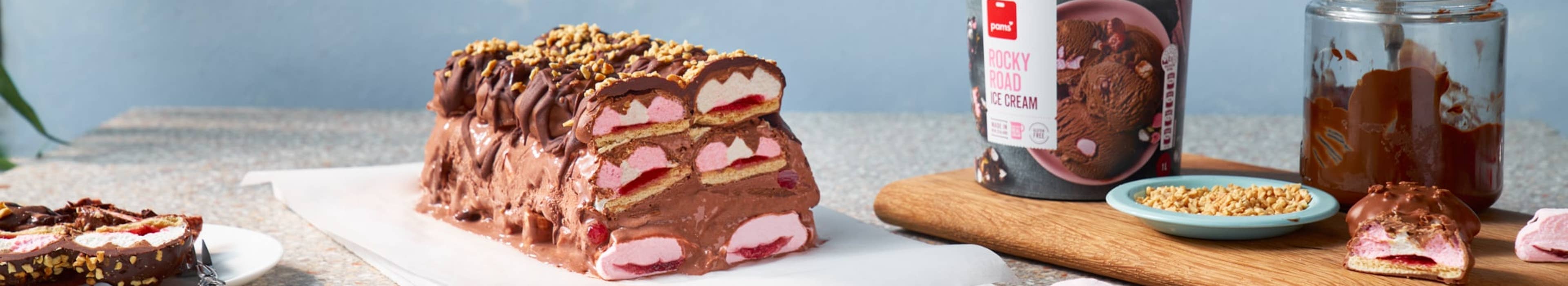 - For an ultra-decadent ice cream cake, add an extra pack of Pams Rocky Road Chocolate Biscuits to the top of your cake before drizzling over the chocolate and nuts.