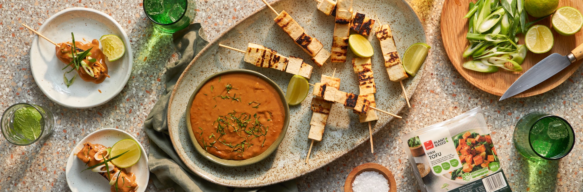 Serve the skewers with satay sauce on the side for dipping, and a scattering of lime wedges.