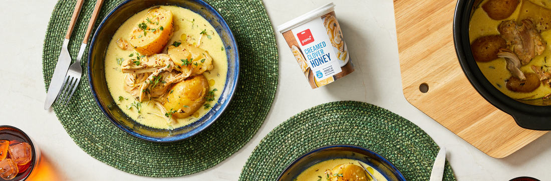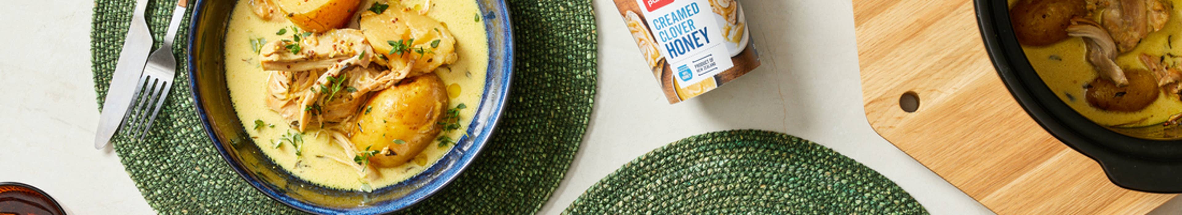 Add the potatoes and chicken to your slow cooker. Add the mustard, honey, thyme (if using) and stock, and season well with salt. Gently toss everything together.