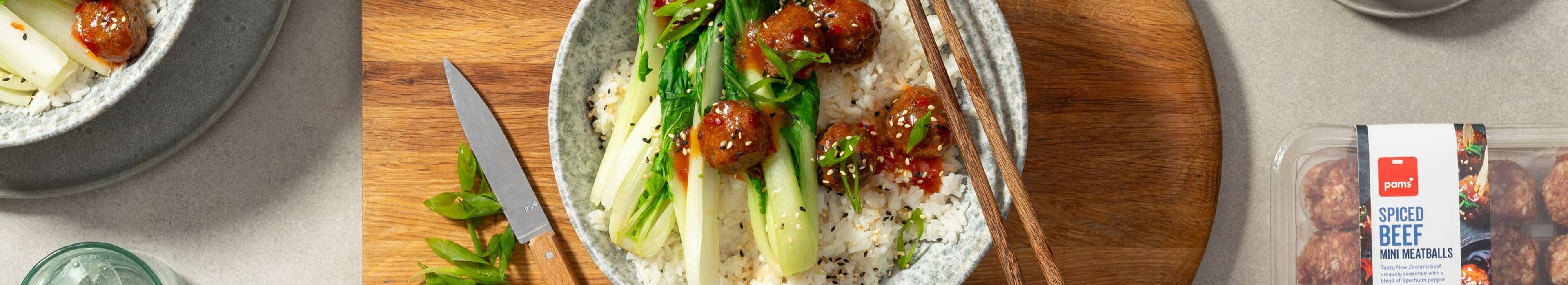 Place the rice in serving bowls and top with the sticky meatballs and bok choy.