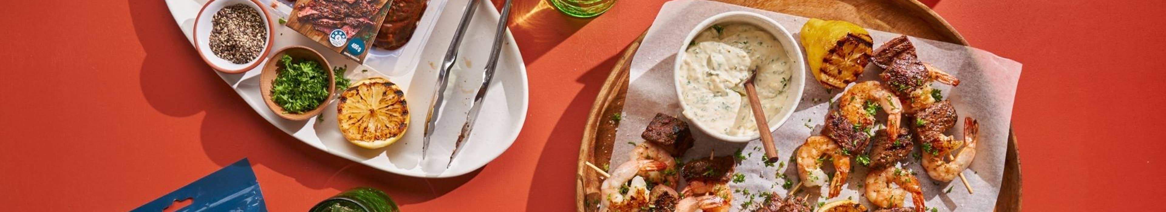 Try our fresh take on the classic surf ’n’ turf with our oh-so-simply barbecued skewers! Jazz up your presentation and add extra flavour by throwing a couple of lemon halves on the grill while your skewers are cooking.