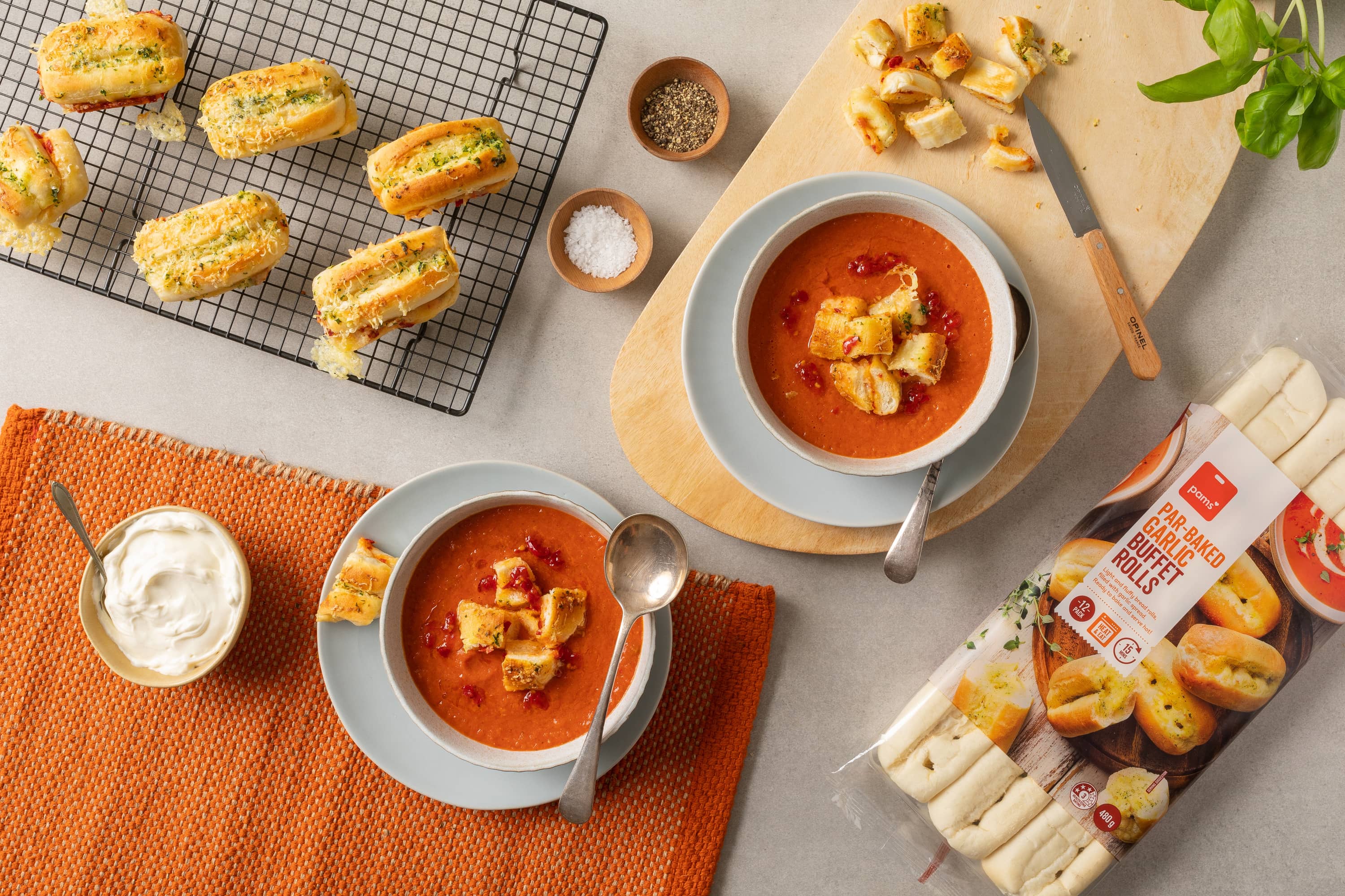 While the soup is simmering, place the remaining crushed chilli into a small bowl. Add a glug of olive oil and season with salt and pepper. Cut the buffet rolls in half, spread with the chilli oil and sandwich back together. Bake in the oven as per packet instructions until crisp and golden. Then, cut into bite-sized croutons.