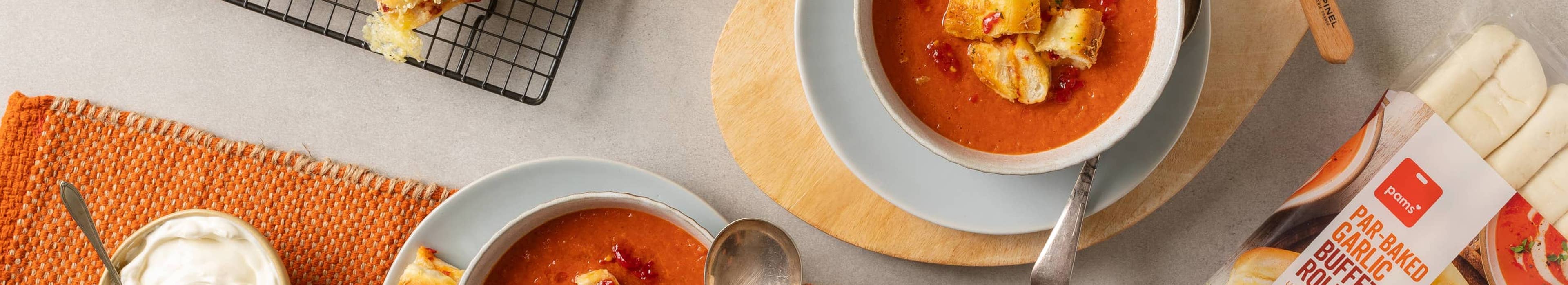 - Add Pams Grated Tasty Cheese to your Pams Buffet Rolls for chilli cheese croutons!
