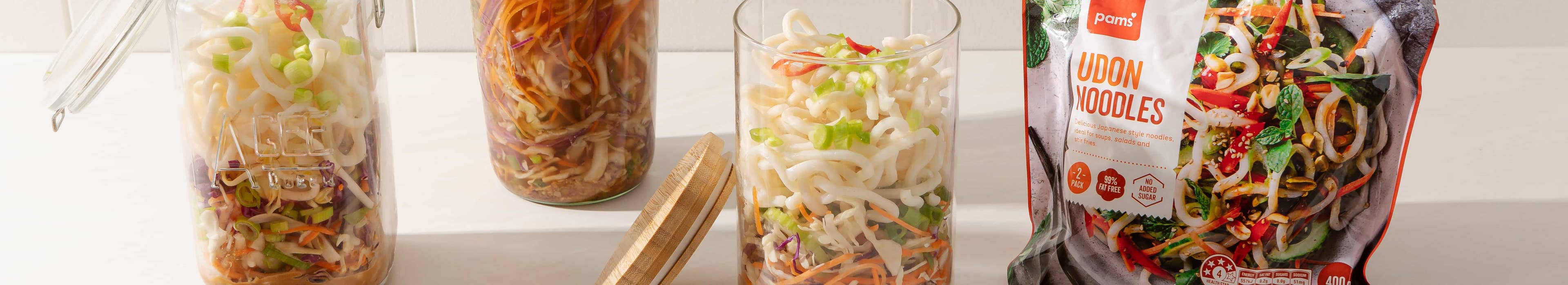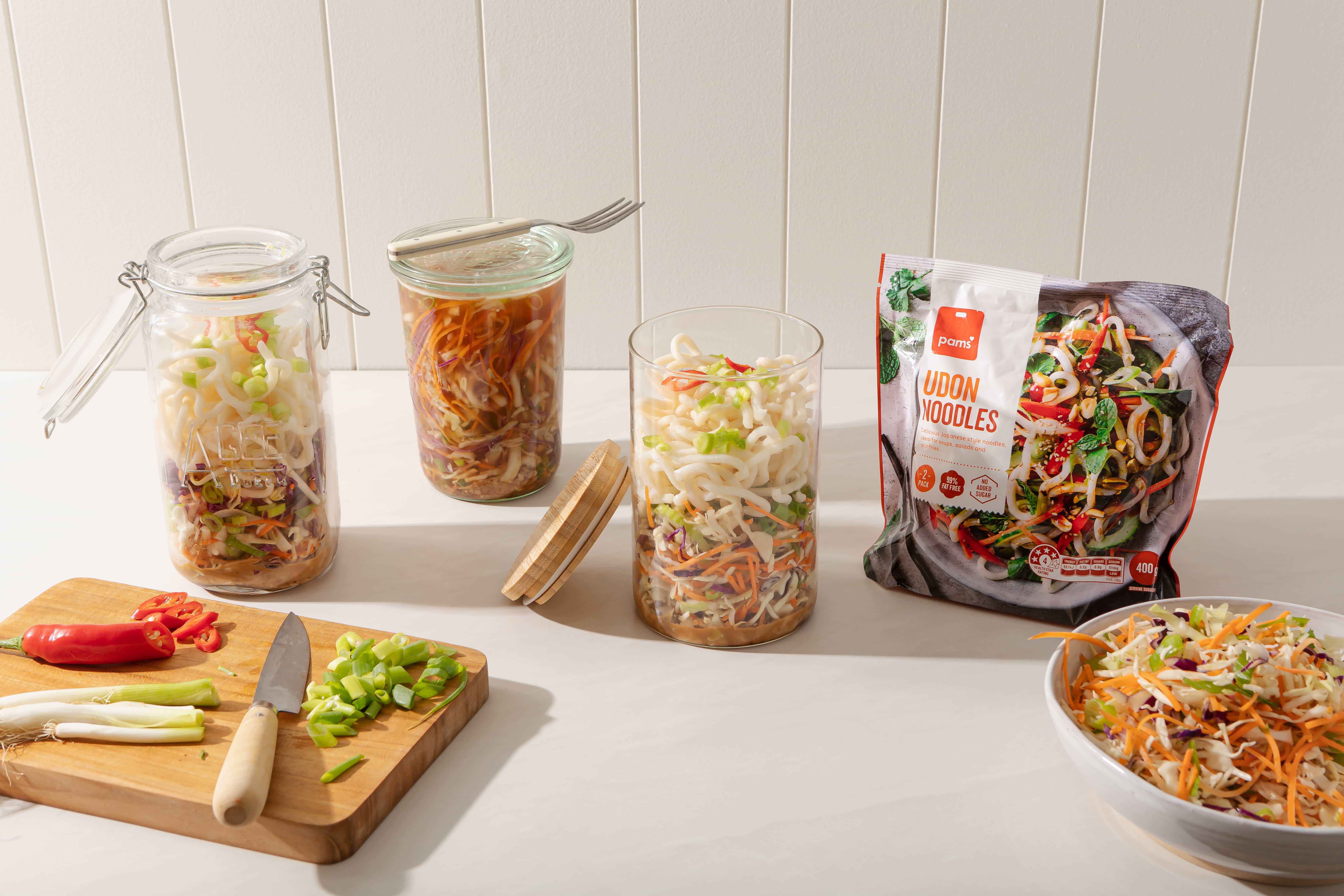 Place about 1 cup of the slaw into each jar and top with the udon noodles. Screw on the lid and keep in the fridge until ready to serve.